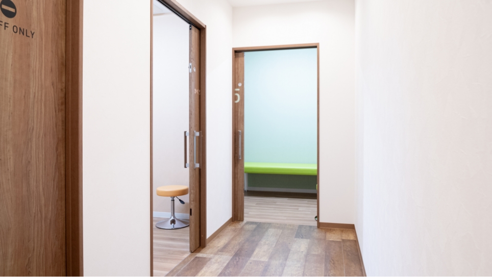 待合いおよび診察室を3つの区域に分け、感染症を広げないための、「空間的な隔離」を行っています(「かくり」「一般」「クリーン」の3区域)。「かくり」区域の待合と2つの診察室はそれぞれ独立した排気設備を設けています。